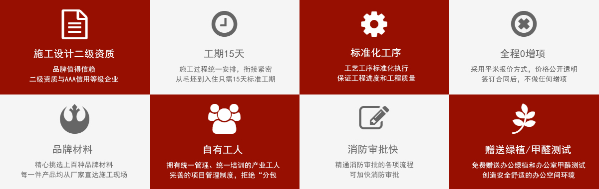 項(xiàng)目均實(shí)行直營,無外包風(fēng)險(xiǎn),依托自有設(shè)計(jì)、施工、項(xiàng)目管控、售后服務(wù)體系,一站式裝修服務(wù)